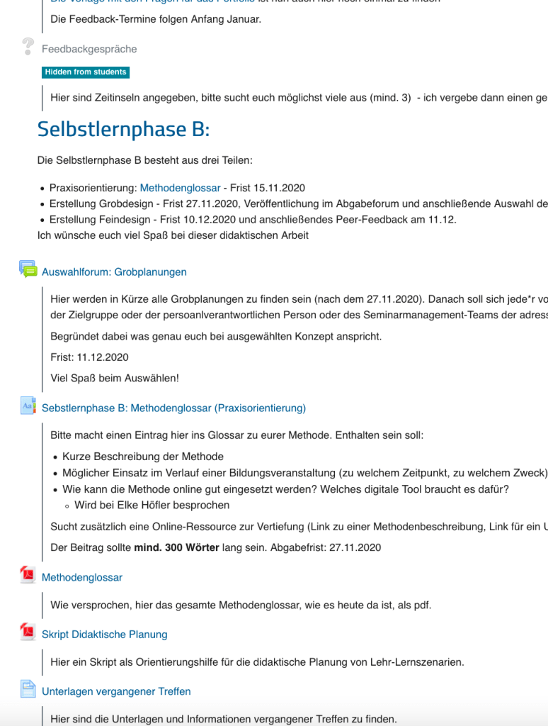 Ein häufiges Argument gegen Textseiten und andere Aufräum-Methoden besteht darin, dass die Lernenden die Inhalte dann möglicherweise nicht finden. Dieses Risiko nehme ich in Kauf und versuche auch meine Materialien und Aktivitäten sehr eindeutig zu beschriften. Diese Kunst verlangt jedoch auch von meiner Seite fortwährende Übung und ich muss immer wieder ausprobieren sowie Feedbackschleifen mit den Lernenden einbauen. Ein letzter Tipp: Wenn ich nicht sicher bin, ob die Lernenden Verlinkungen erkennen (auf eine Textseite, ein Dokument oder einen externen Link) schreibe ich in Klammern (klick). Oder ich verlinke direkt auf das Wort „klick“.